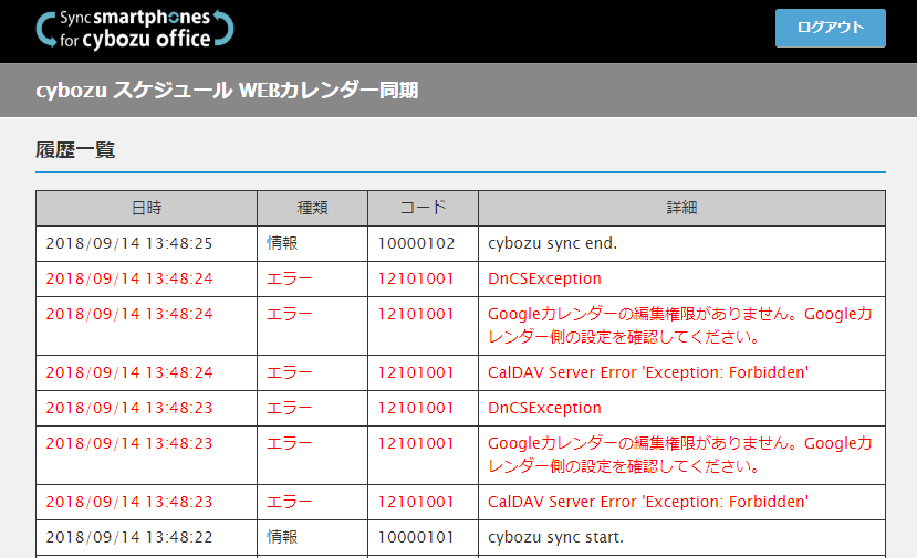 変更権限がない場合は「CalDAV Server Error ‘Exception: Forbidden’」というエラーメッセージが履歴一覧画面へ出力されます。