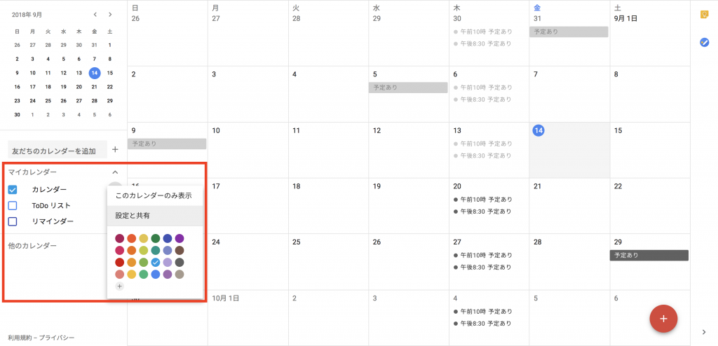 左部「マイカレンダー」の同期したいカレンダーのメニューを表示し、「カレンダー設定」を選択します。