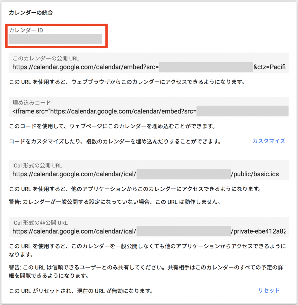 ページ下部「カレンダーアドレス」の「カレンダーID」下に記載された文字列を確認してください。