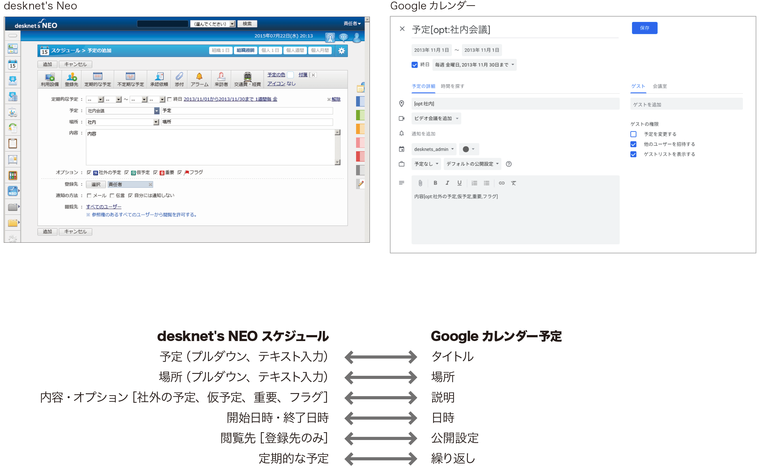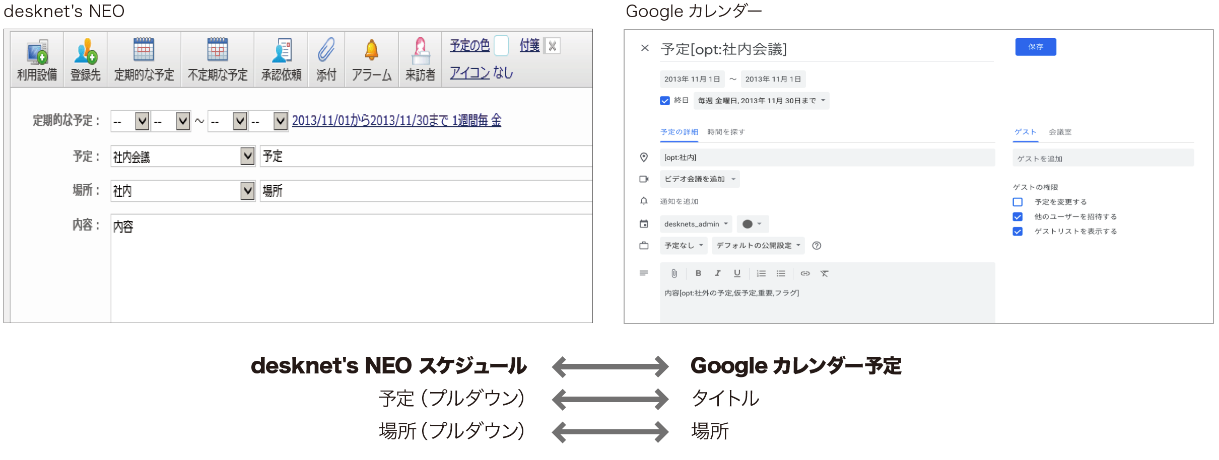 下記に示すdesknet’s NEOスケジュール項目について、Googleカレンダー予定の対応する項目に[opt:(プルダウン内容)]という形で同期されます。