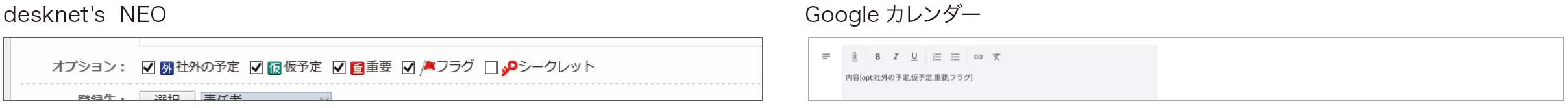 また、Googleカレンダー側で[opt:(プルダウン内容)]と表記することで、内容がdesknet’s NEO側の項目へ反映されます。
